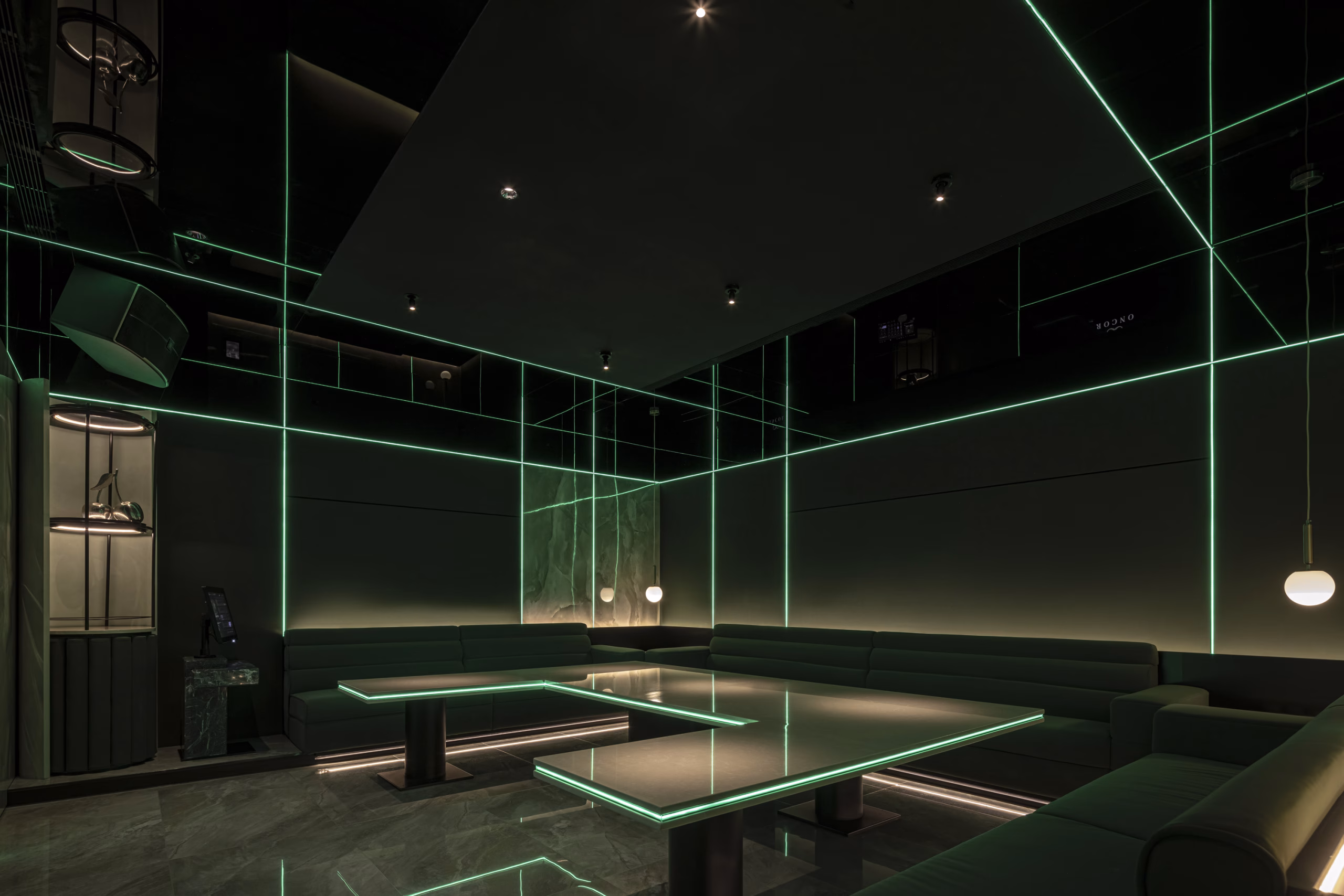 三種情緒風格 ×四種房型尺寸,滿足從隱密聚會到多人派對的多元需求。 以劇場般的情緒敘事,透過三種代表氛圍的包廂色彩,搭配鏡面與金屬材質的層次交織,打造出極具個性的沉浸空間。